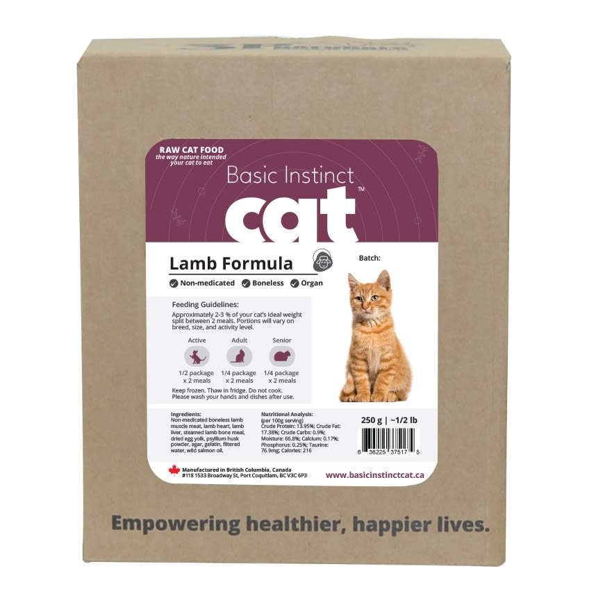 Basic Instinct is raw cat food designed to meet the specific nutritional needs of cats. This formula is made up of natural supplements and a balance of organs, meat and bone to give your cat optimal health. Add a red meat to your cat's diet as part of a rotation diet to ensure greater health.