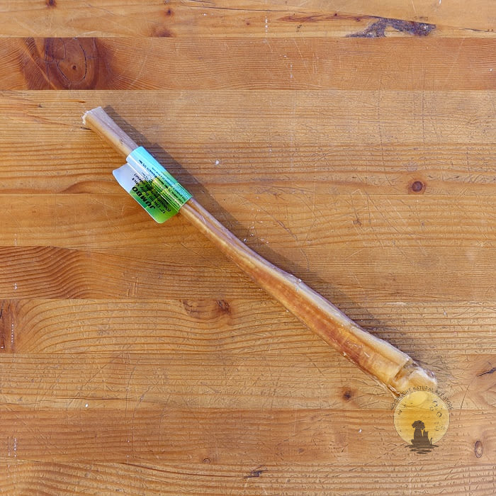 First, the bull’s private parts are cleaned, hung, and stretched. Then they get dried, oven baked or smoked. The result is a long stick, which is then cut into smaller pieces – usually 6” or 12” to suit different dog breeds.