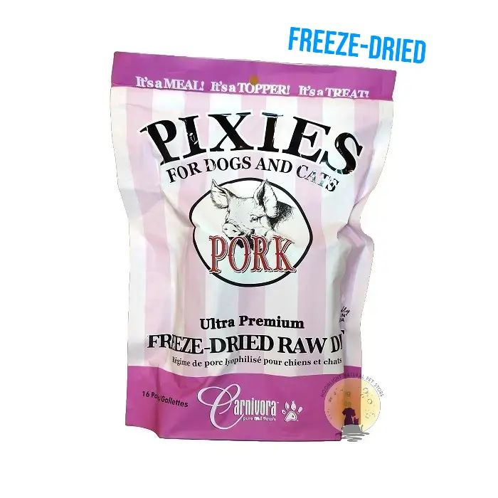 When hydrated, the freeze-dried patties have the same nutritional qualities as our frozen Pixies. This is why we display the nutrition facts as such on the backs of the bags.