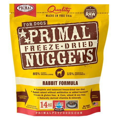 Ingredients: Rabbit (with ground bone), Organic Squash, Organic Carrots, Organic Kale, Organic Apples, Organic Broccoli, Organic Blueberries, Organic Cranberries, Organic Parsley, Egg, Organic Sunflower Seeds, Organic Pumpkin Seeds, Dried Yeast, Montmorillonite Clay, Organic Apple Cider Vinegar, Cod Liver Oil, Fish Oil, Organic Coconut Oil, Organic Sunflower Oil, Vitamin E Supplement, Organic Ground Alfalfa, Dried Organic Kelp, Liquid Lactobacillus acidophilus fermentation product, Liquid Lactobacillus casei fermentation product, Liquid Lactobacillus reuteri fermentation product, Liquid Bifidobacterium animalis fermentation product, Organic Rosemary Extract, Taurine