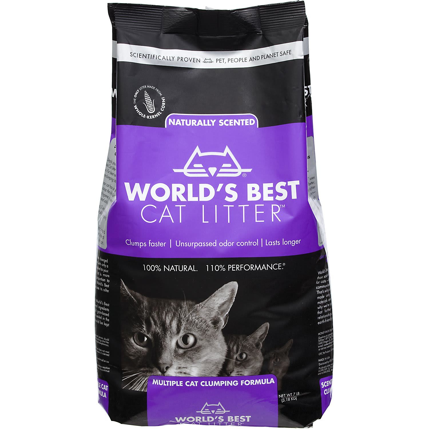 Smell the flowers, not the litter box, with the World's Best Lavender Multiple Cat Clumping Cat Litter. This litter is 100% natural and dust-free. The outstanding odor control and quick clumping combined with the easy scooping cleanup of the Multiple Cat Clumping Formula, is now added to a 100% all-natural scented lavender oil for a fresh floral fragrance. No synthetic chemicals or perfumes. The concentrated power of corn means it’s silica dust free, and proven flushable for easy cleanup. Ideal for homes with two or more cats. Try the World's Best Cat Litter Lavender Multiple Cat Clumping for: